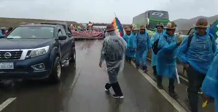#Ultimo Cooperativistas hacen el resguardo de la marcha de las organizaciones sociales afines al MAS rumbo a #LaPaz. En medio de la lluvia y bajas temperaturas, la movilización cumple su cuarto día de caminata. (Video: Radio Kawsachun Coca) pic.twitter.com/sMqG9essIU