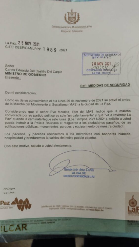 #ANF El alcalde de #LaPaz envió una carta al ministro de Gobierno, @EDelCastilloDC, con el fin de solicitar medidas de seguridad para la población, oficinas de instituciones públicas y monumentos durante el arribo de la marcha de organizaciones sociales afines al MAS. pic.twitter.com/6DTcDhuZ3K