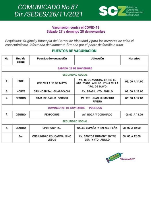 Puntos de vacunación para este fin de semana.Categorías NoticiasEtiquetas , Facebook, Periodismo Somos Todos 27/11/2021 Puntos de vacunación para este fin de semana. Fuente: Periodismo Somos Todos => Recibir por Whatsapp las noticias destacadas