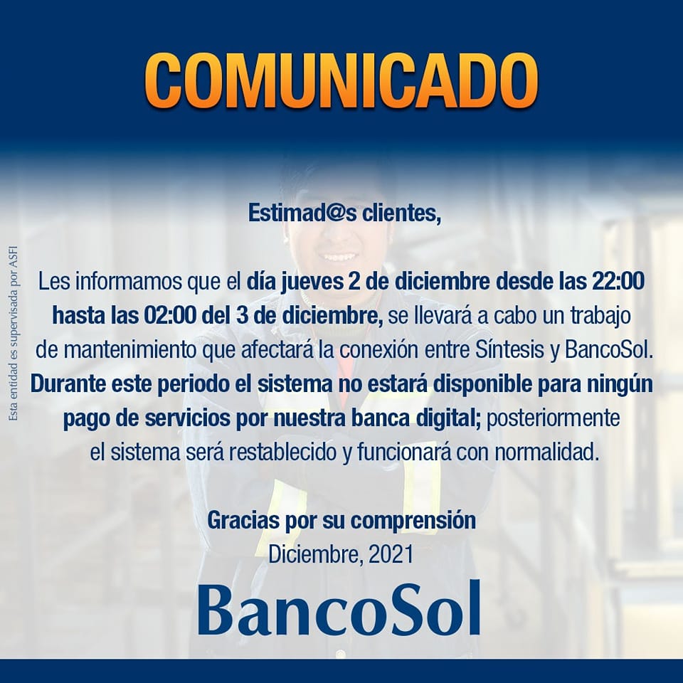BancoSol comunica que este jueves, desde las 22:00 hasta las 2:00 del viern…