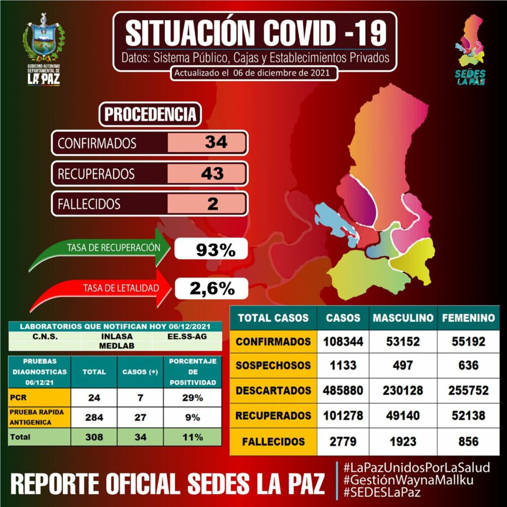 #ANF El @SEDES_La_Paz reporta, este lunes, 34 nuevos contagios de #COVID19 y dos decesos. De los nuevos casos, seis corresponden a #ElAlto, siete a #LaPaz y 21 a áreas rurales. https://t.co/76DbSJiSMA