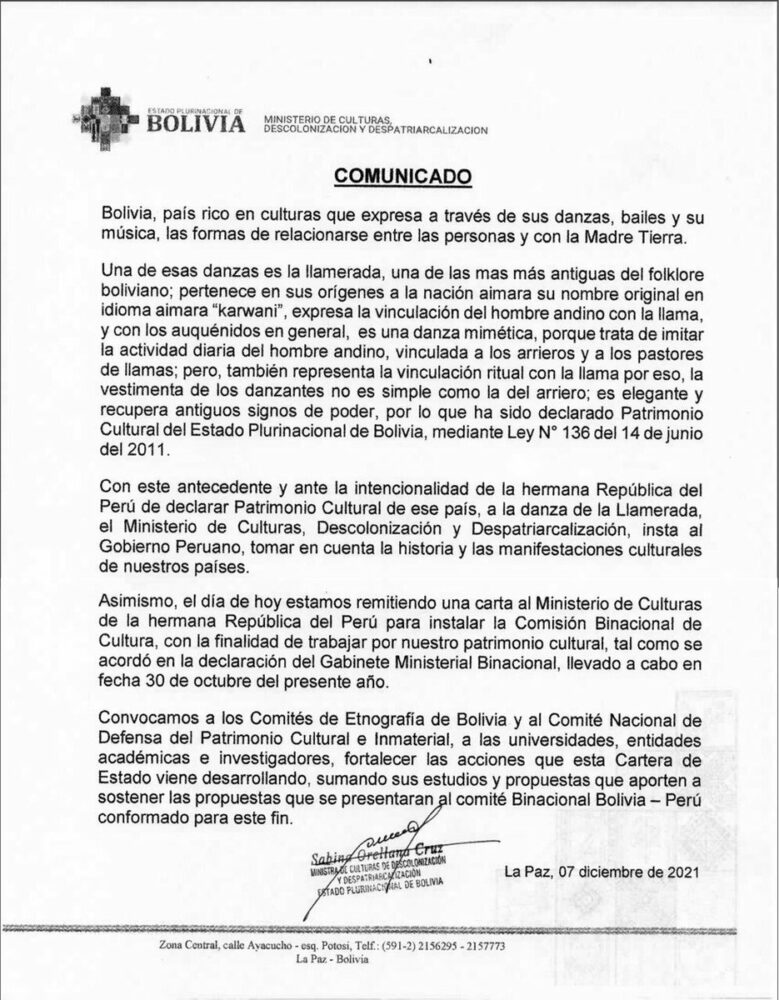 #ANF Ante la intensión de #Perú de declarar a la danza Llamerada como patrimonio, el Ministerio de Culturas pide al Gobierno peruano respetar el patrimonio cultural boliviano. Mediante un comunicado, recuerda que la Llamerada pertenece, en sus orígenes, a la nación aymara. pic.twitter.com/o32m4b9okJ