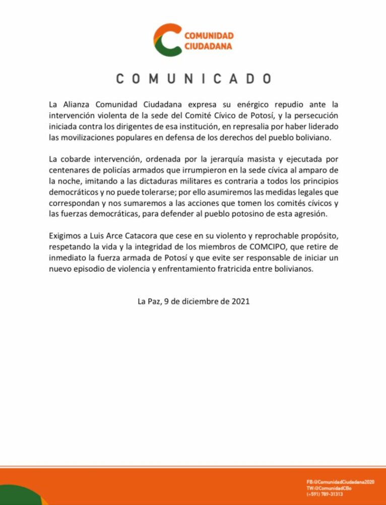 #Último #ANF La Alianza Comunidad Ciudadana expresó su enérgico repudio a la intervención violenta de la sede del Comité Cívico Potosinista.