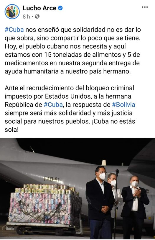 Arce, a tráves de sus redes, informa que llevó a Cuba 15 toneladas de alimentos y 5 de medicamentos.