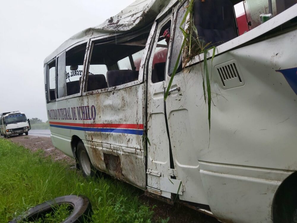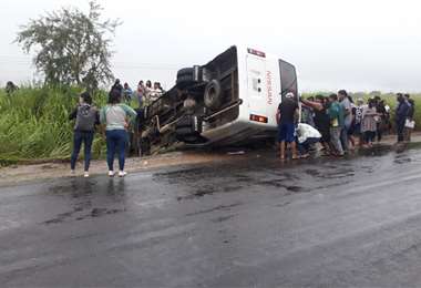 #ANF Un microbús de la Facultad Integral de Ichilo, dependiente de la UAGRM, volcó esta mañana en la ruta que une el norte integrado con la ciudad de #SantaCruz. Reportes preliminares señalan que al menos 16 estudiantes quedaron heridos y fueron auxiliados. (Vía @grupoeldeber) pic.twitter.com/VCrjrxruMK