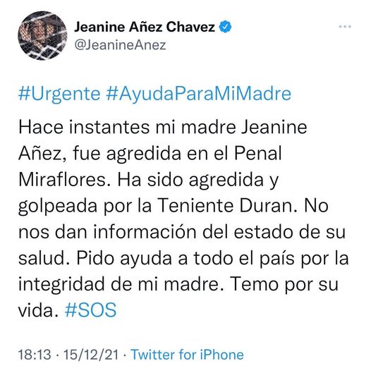 #Urgente Jeanine Añez ha sido agredida y golpeada en su celda esta tarde Su hija Carolin…