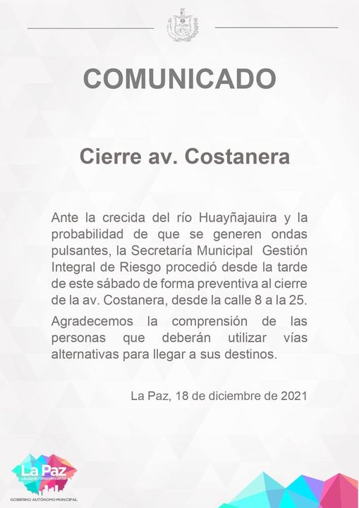 Alcaldía cierra Av. Costanera ante intensas lluvias en la ciudad de La PazCategorías NoticiasEtiquetas , Detrás de la Verdad, Facebook 18/12/2021 Fuente: Detrás de la Verdad