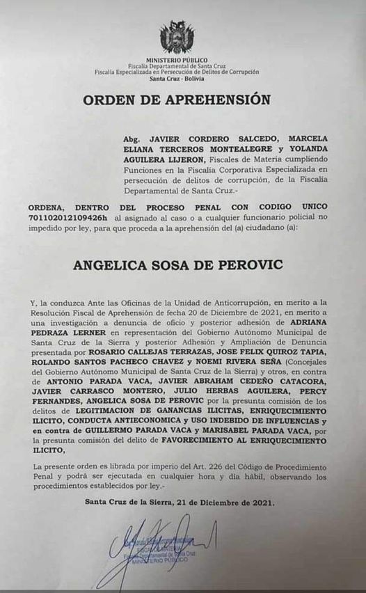 Fiscalía emite orden de aprehensión contra la ex alcaldesa de Santa Cruz Angelica Sosa de Perovic
