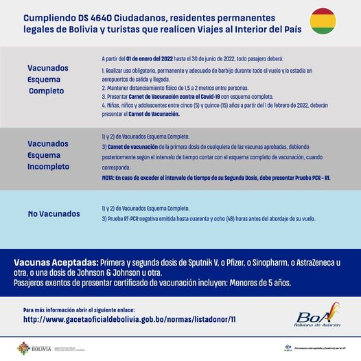 La empresa estatal BoA informó que desde el 1 de enero del 2022 se exigirá el carnet de vacuna anticovid y otros nuevos requisitos para vuelos nacionales.