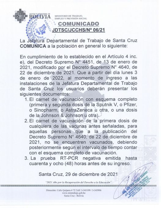 Desde el Lunes 03 del 2022, debes portar tu certificado de vacunación. Así lo dice el Comunicado desde El Ministerio de Trabajo, empleo y previsión nacional.