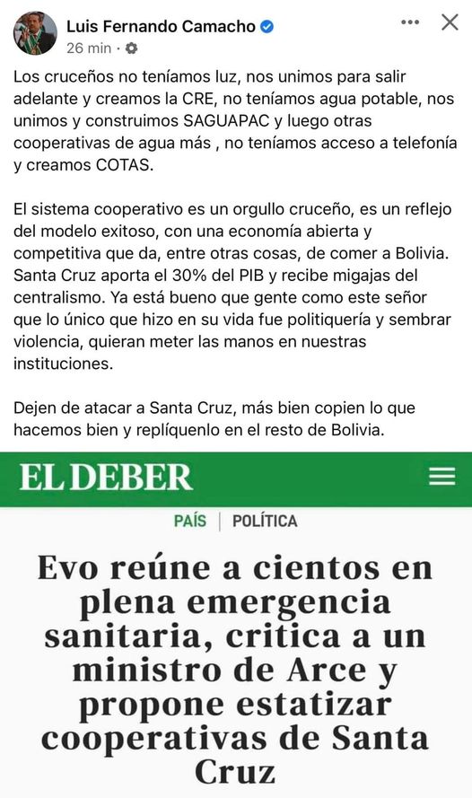 El Gobernador Luis Fernando Camacho le responde a Evo Morales.