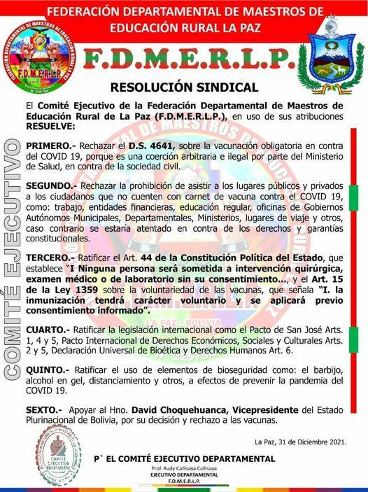 La Federación Departamental de Maestros de Educación Rural de La Paz expresó su rechazo al decreto que establece la exigencia del carnet de vacuna.