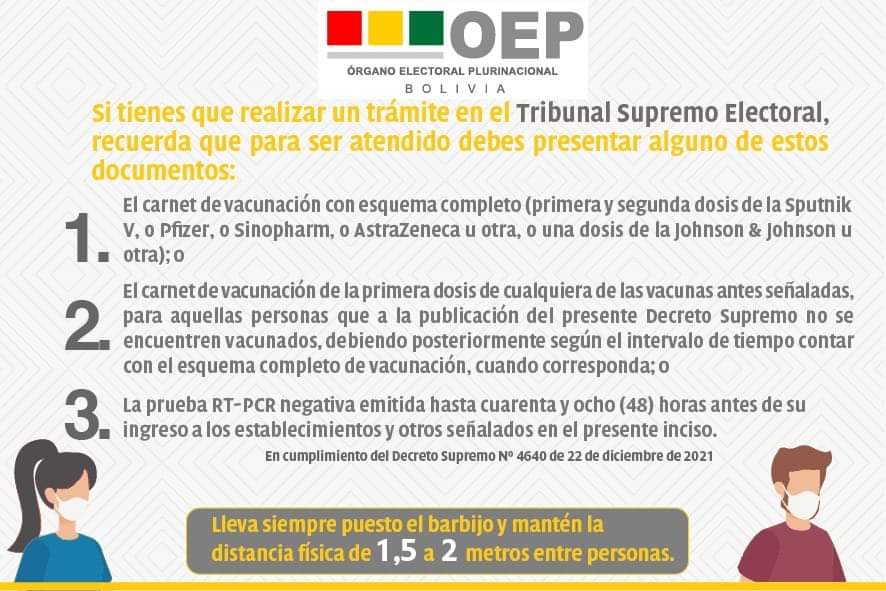 #ANF A partir de este lunes el @TSEBolivia solicitará el carnet de vacunación contra el #COVID19 o la prueba RT-PCR actualizada, a la población que realice cualquier trámite en esta entidad. https://t.co/YHR4wAZTx3
