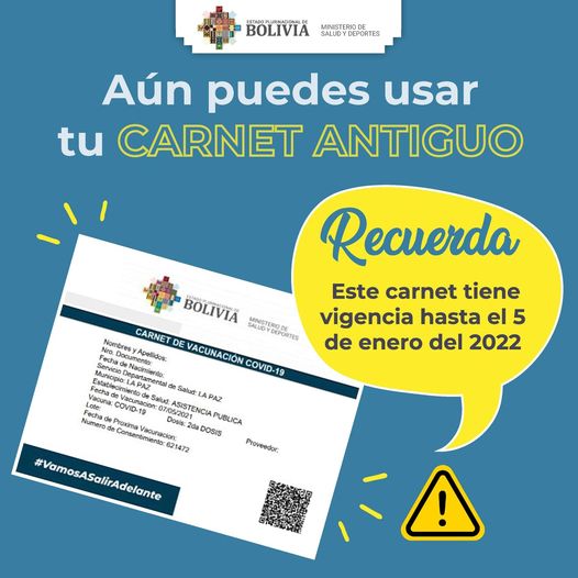 El Ministerio de Salud y Deportes comunica a la población en general que la vigencia del carnet de vacunación generado con anterioridad al Decreto Supremo 4641 tiene vigencia hasta el 5 de enero de 2022.