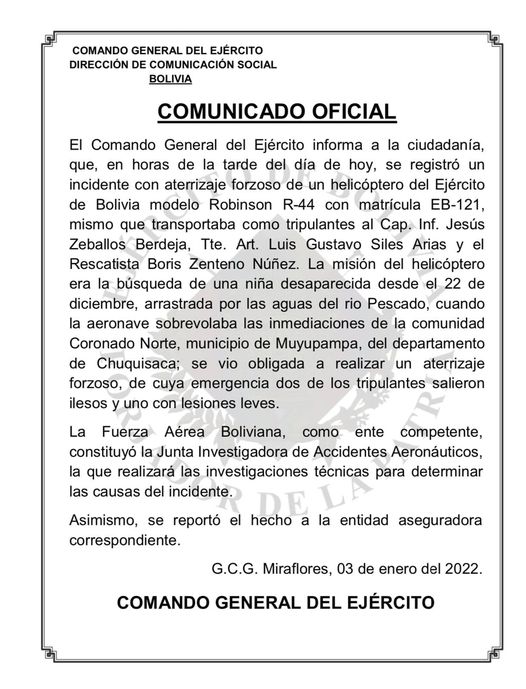 Ejército informa de incidente con aterrizaje forzoso del helicóptero con matrícula EB-121, que realizaba la búsqueda de una niña desparecida en la comunidad Coronado Norte