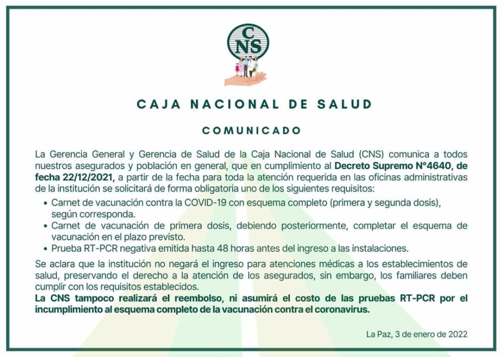#ANF La Caja Nacional de Salud (CNS) comunica que en todas sus oficinas administrativas se exigirá carnet de vacuna o prueba PCR negativa. https://t.co/96DWcPuXno