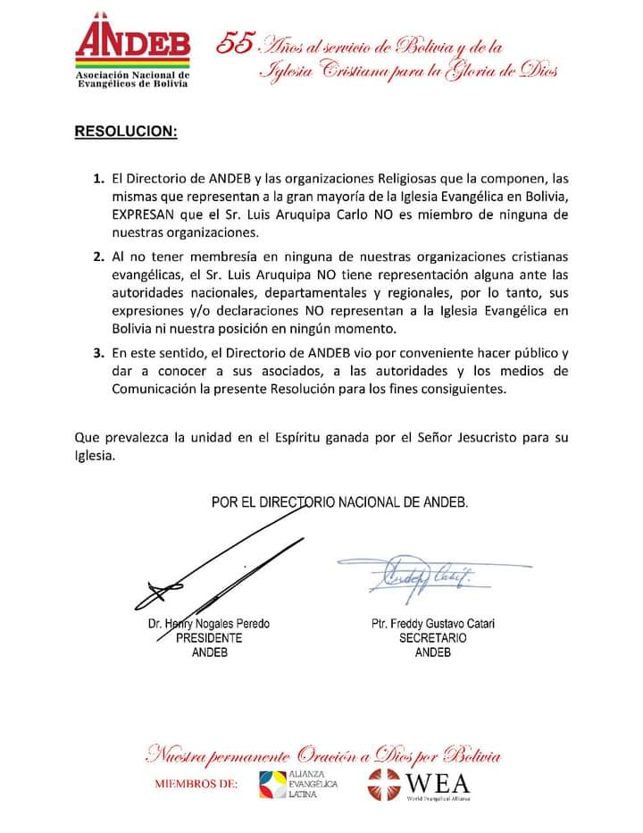 La Asociación Nacional de Evangélicos de Bolivia (ANDEB) aclara que el señor Luis Aruquipa Carlo, autoproclamado presidente del Consejo Nacional Cristiano de iglesias evangélicas de Bolivia, no es miembro de ninguna organización cristiana evangélica reconocida en Bolivia.