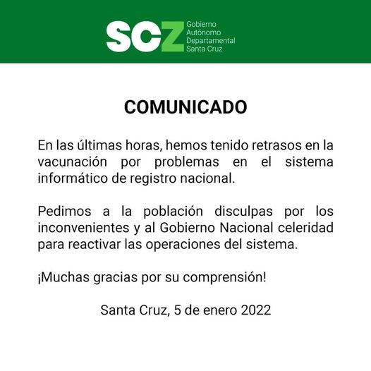 #ANF La @GobSantaCruz informa que los retrasos en el proceso de vacunación #anticovid se debe a problemas en el funcionamiento del sistema nacional dependiente del Ministerio de Salud. https://t.co/6mDE5JjESQ