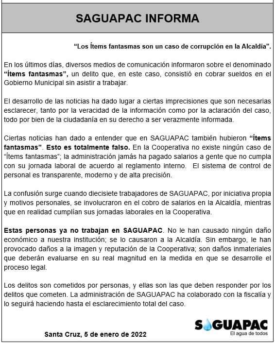 #Ultimo @SAGUAPACC informa que en esa cooperativa «no existe ningún caso de ‘ítems fantasmas’ y que la administración jamás ha pagado salarios a gente que no cumpla con su jornada laboral». https://t.co/1u5ijJtSPl