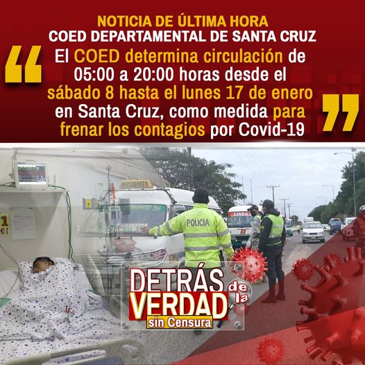 COED determina circulación vehicular de 05:00 a 20:00 horas desde el 8 de enero y descartan cuarentena rígidaCategorías NoticiasEtiquetas , Detrás de la Verdad, Facebook 06/01/2022 Fuente: Detrás de la Verdad