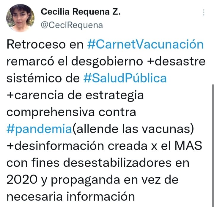 #Ultimo La senadora de CC, @CeciRequena, cuestiona la suspensión de la presentación del carnet de vacuna hasta el 26 de enero. "Retroceso en #CarnetVacunación remarcó el desgobierno + desastre sistémico de #SaludPública + carencia de estrategia contra #pandemia", tuiteó. pic.twitter.com/teEHZCA8n0