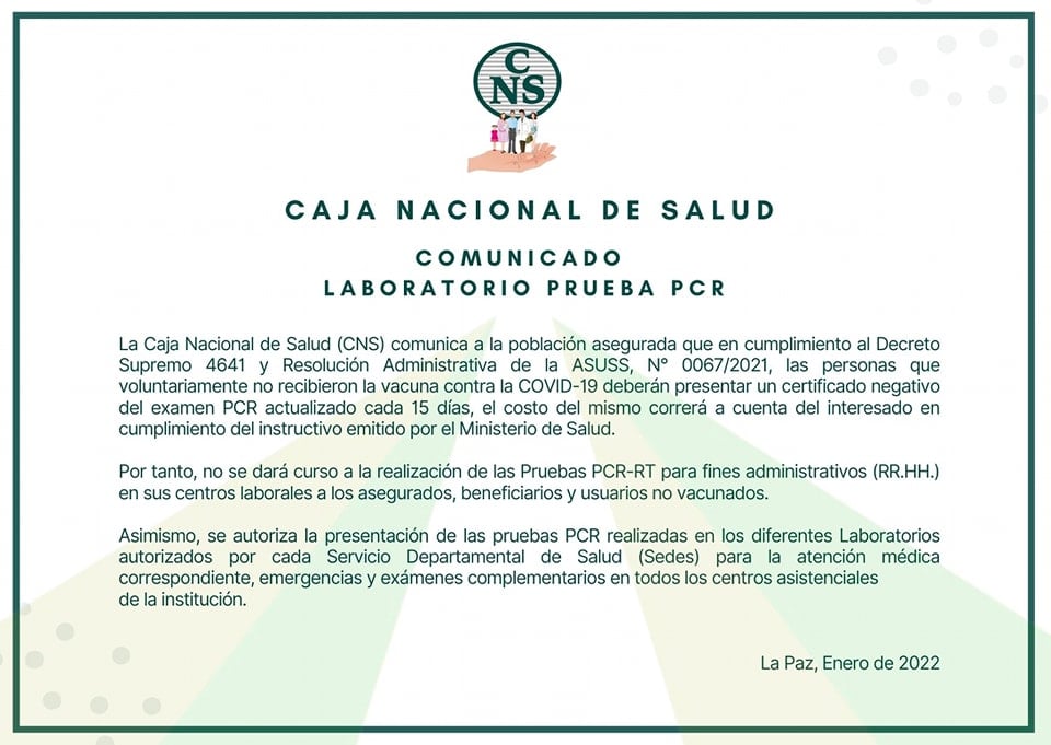 #ANF La Caja Nacional de Salud (CNS) aclara que no tomará pruebas PCR a asegurados, beneficiarios y usuarios no vacunados que lo requieran para fines administrativos en sus fuentes laborales. https://t.co/S2QKnWE2kK