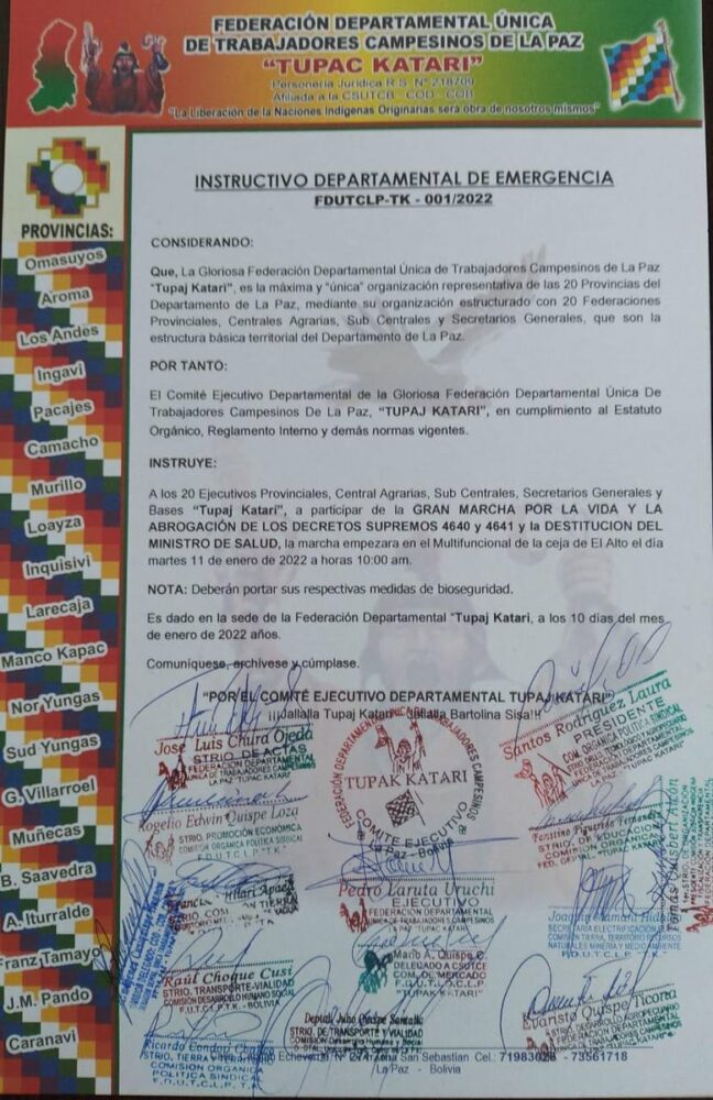 #ANF La Federación Departamental Única de Trabajadores Campesinos de La Paz “Tupac Katari” convoca a una “gran marcha” para este martes para exigir la abrogación de los decretos 4640 y 4641, que establece la exigencia de los carnets de vacuna o prueba PCR. pic.twitter.com/u4fp8IrJvP