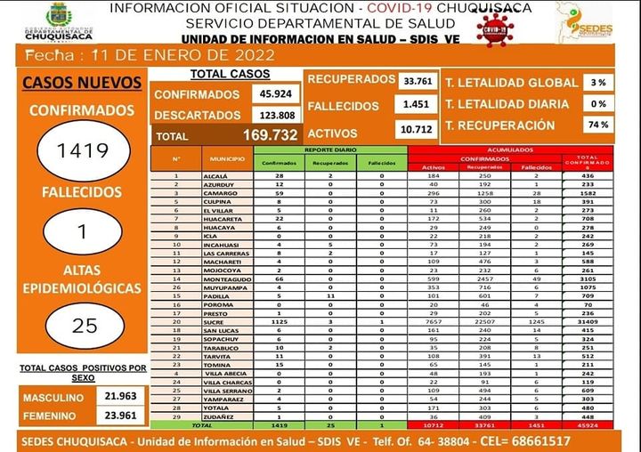 #ANF El departamento de #Chuquisaca registra la cifra más alta de contagios. Este martes el Sedes reportó 1.419 nuevos casos y un deceso. pic.twitter.com/9gDGu15L9B