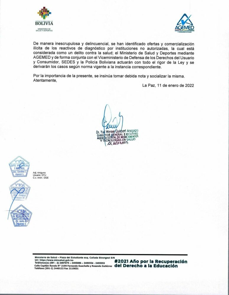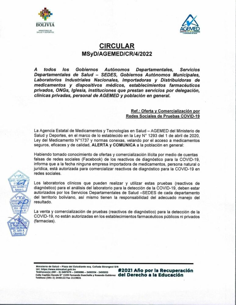 #ANF La Agemed informa que se conoció que mediante las redes sociales se oferta y comercializa reactivos de diagnóstico para la #COVID19 y aclara que a la fecha ninguna empresa importadora de medicamentos o persona natural o jurídica está autorizada para comercializar las mismas. https://t.co/myWvdiPbgn