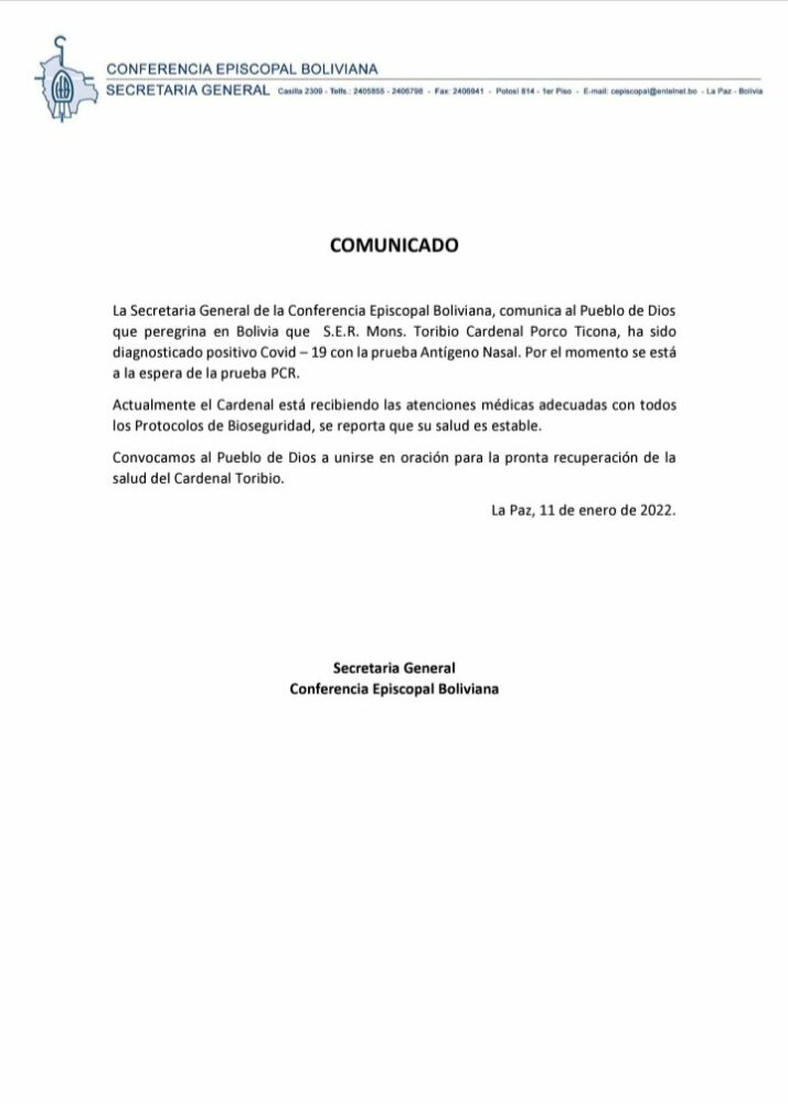#Ultimo La Conferencia Episcopal Boliviana (CEB) confirma que el cardenal Toribio Porco Ticona dio positivo a #COVID19 y que recibe las atenciones médicas correspondientes. https://t.co/fBJHP4kxJY