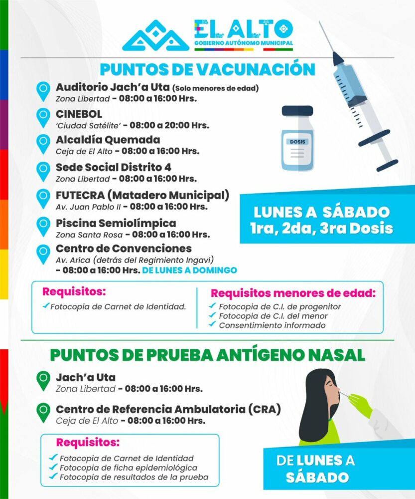#ANF Conozca los puntos habilitados en la ciudad de #ElAlto para la vacunación anticovid y pruebas antígeno nasal. pic.twitter.com/NDDgBcfRvT