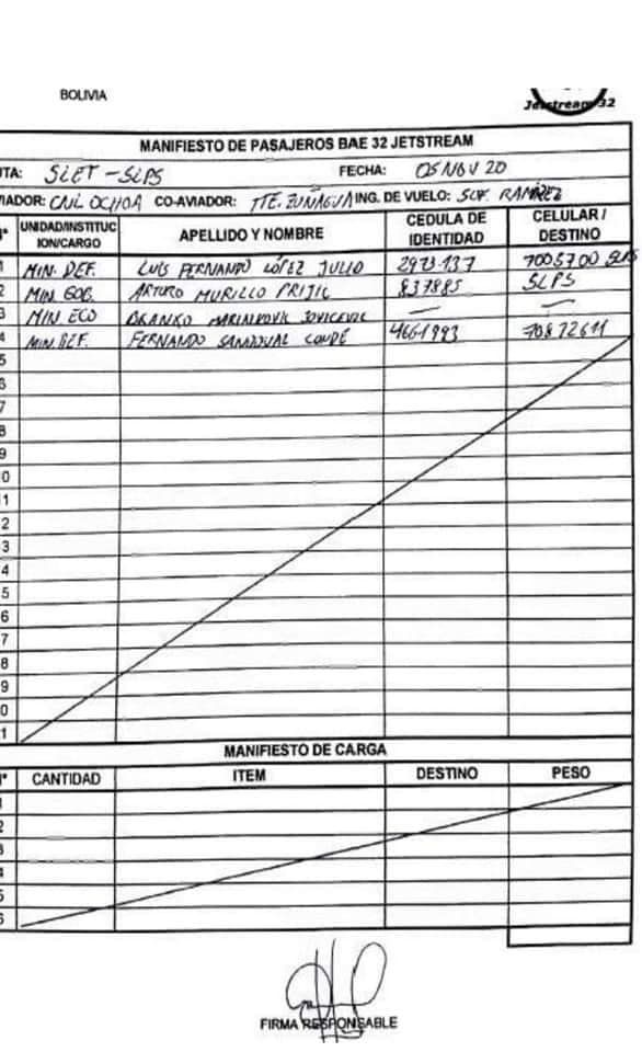 Este es el avión FAB-046 y el manifiesto de pasajeros del día que fugó Murillo y López desde Santa Cruz Los ex ministr…
