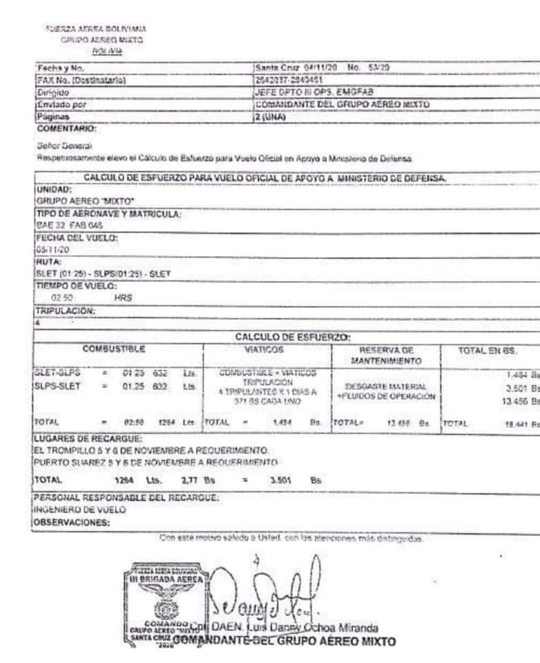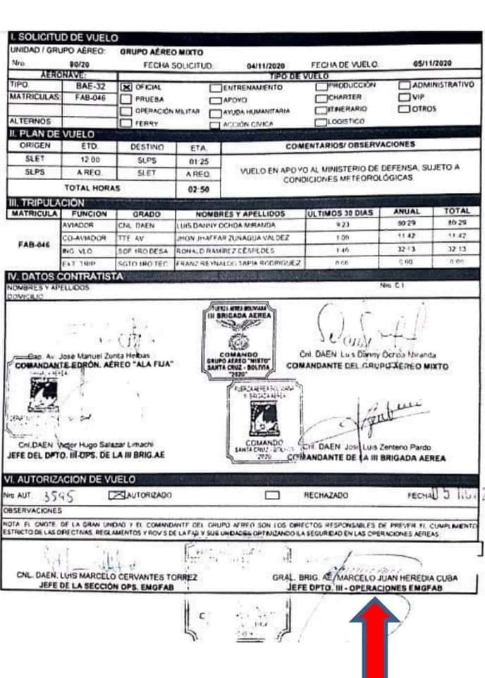 De acuerdo al itinerario de vuelo los ex ministros salieron en horas de la mañana del aeropuerto el Trompillo con la autorización del actual Comandante de la FAB, Gral. Marcelo Heredia hacia el aeropuerto de Puerto Suárez, la hija de ruta fue firmada por el Cnl. Luis Ochoa Miranda.