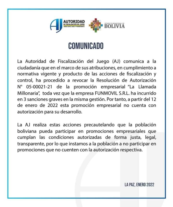 #ANF La @ajcomunica informó que se revocó la Resolución de Autorización de la Promoción Empresarial «La Llamada Millonaria», por «incurrir en tres sanciones graves en la misma gestión». https://t.co/3NWUdaCGpW