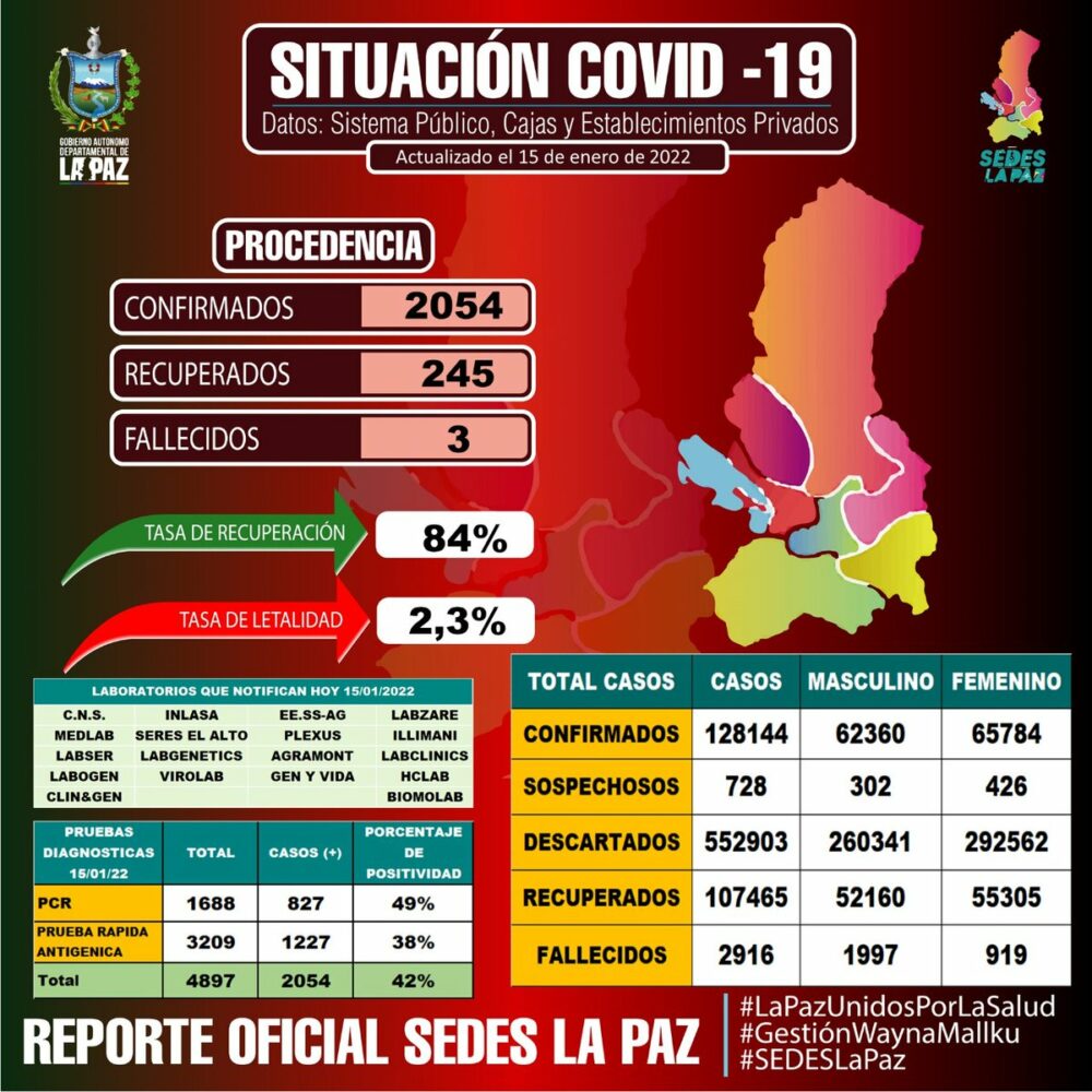 #ANF El departamento de La Paz registró este sábado 2.054 nuevos casos positivos de Covid-19 con tres fallecidos. Los recuperados de la enfermedad fueron 245. pic.twitter.com/FbYZGxK92M