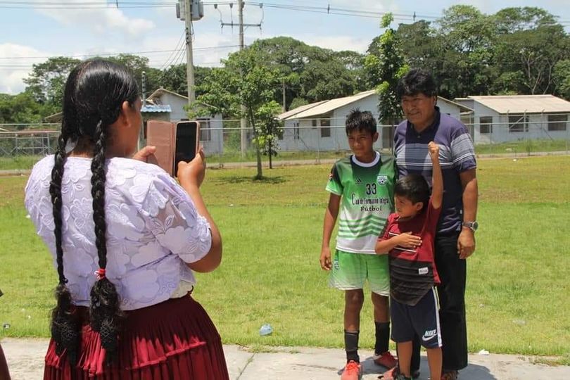 Evo Morales con un niño que levanta el puño izquierdo y se pone la mano derecha en el corazón. El líder Nacional del #MAS_IPSP acompañado del técnico cochabambino Mauricio Soria compartió experiencias con el fin de contribuir el fútbol en el trópico de Cochabamba.