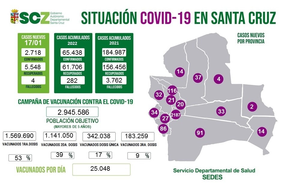 #ANF El departamento de #SantaCruz reportó este lunes 2.718 nuevos contagios y 4 fallecidos, según el reporte del SEDES. pic.twitter.com/Qg86qZ1BDt