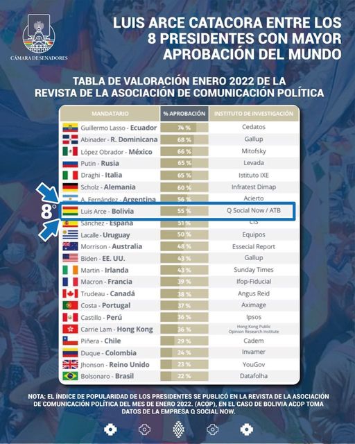 La revista de la Asociación de Comunicación Política (ACOP) del mes de enero 2022, ubica a @LuchoXBolivia en el 8vo lugar de los presidentes con mayor aprobación del mundo.