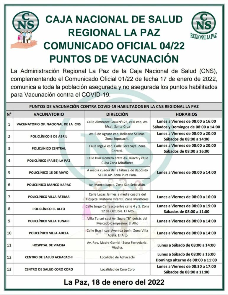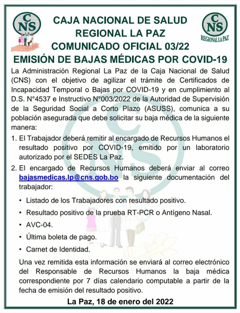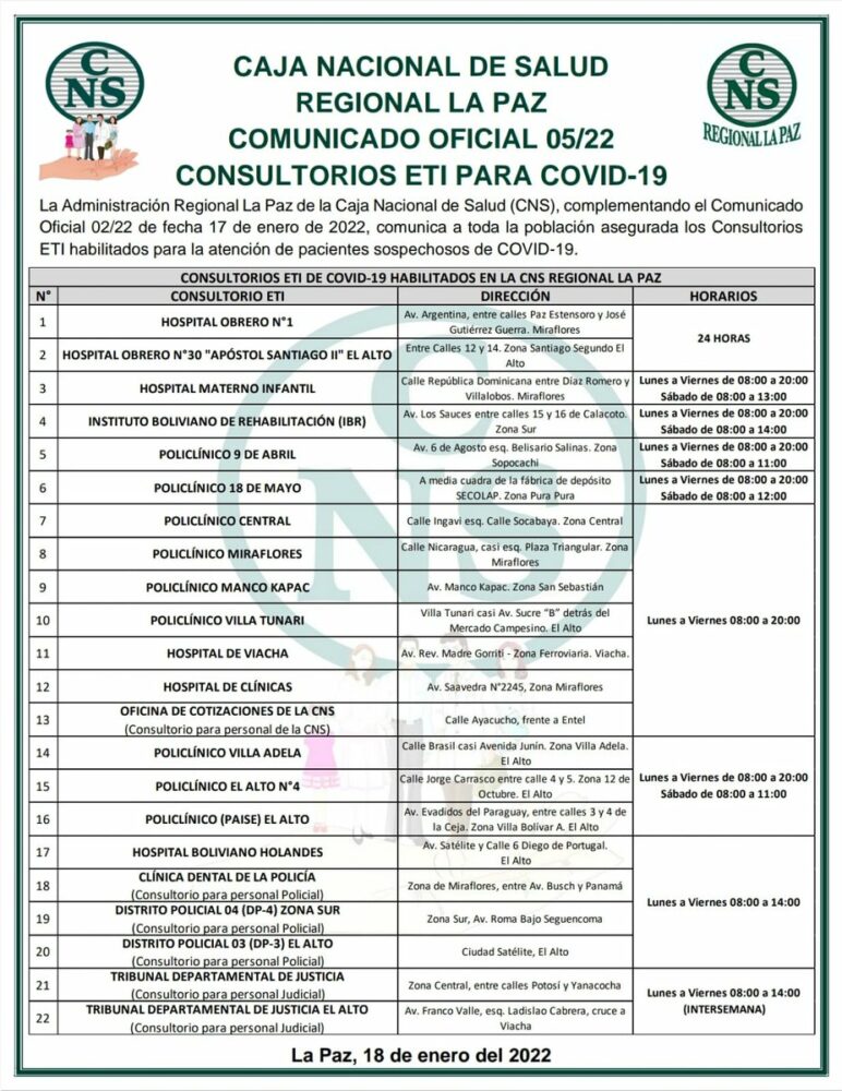 #ANF La Caja Nacional de Salud (CNS) difunde información con relación a las bajas médicas virtuales por COVID-19, nuevos puntos de vacunación y nuevos consultorios ETI para coronavirus. https://t.co/OhLxtsJ7y1