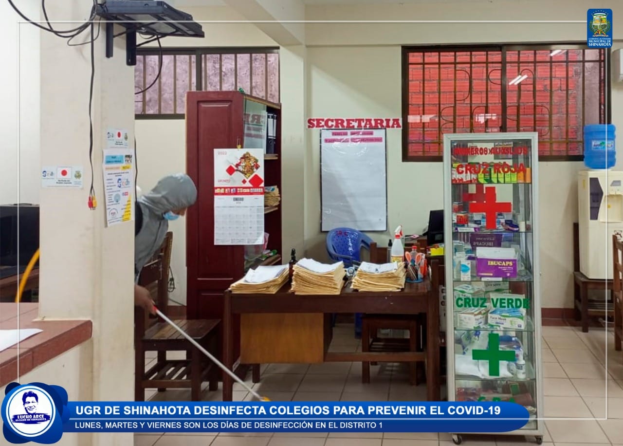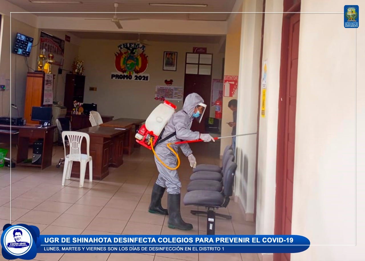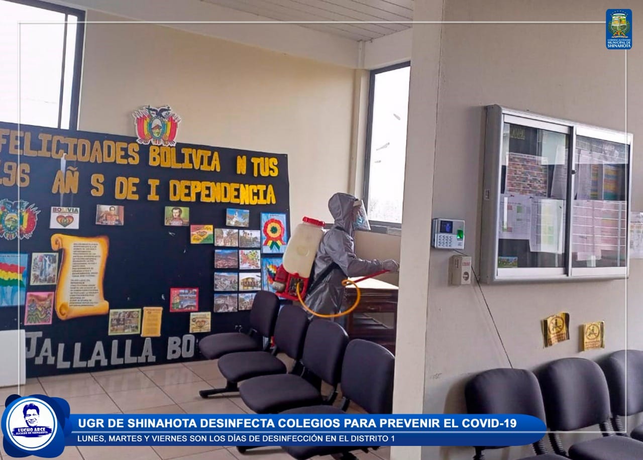 La Unidad de Gestión De Riesgos URG del GAM Shinahota inició este lunes con la desinfección en las unidades educativas para prevenir el COVID – 19, el trabajo se desarrolla porque las inscripciones escolares aglomeran a muchos padres de familia en esta cuarta ola del coronavirus.