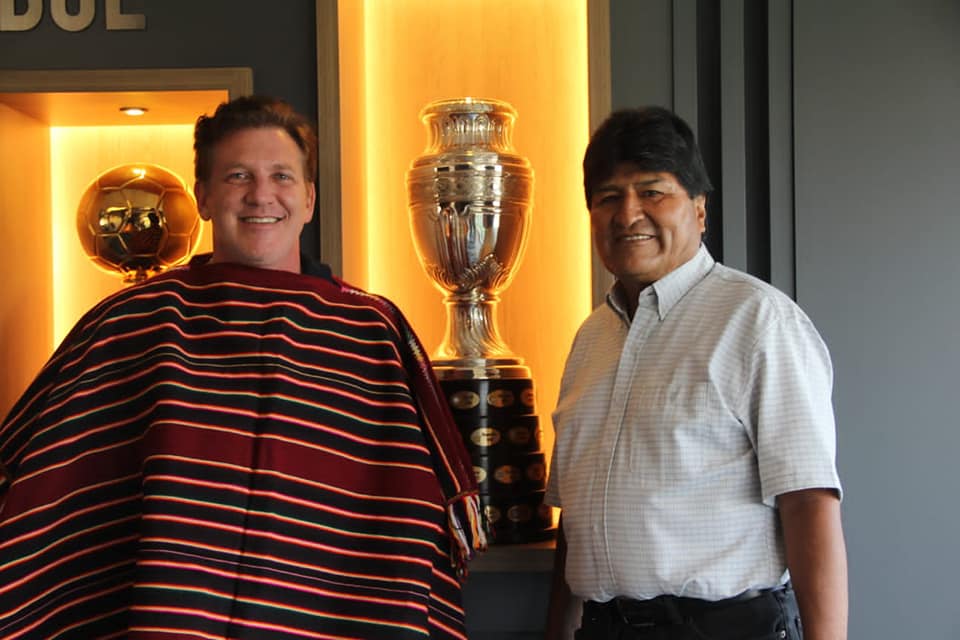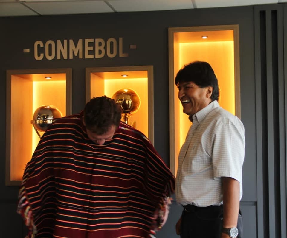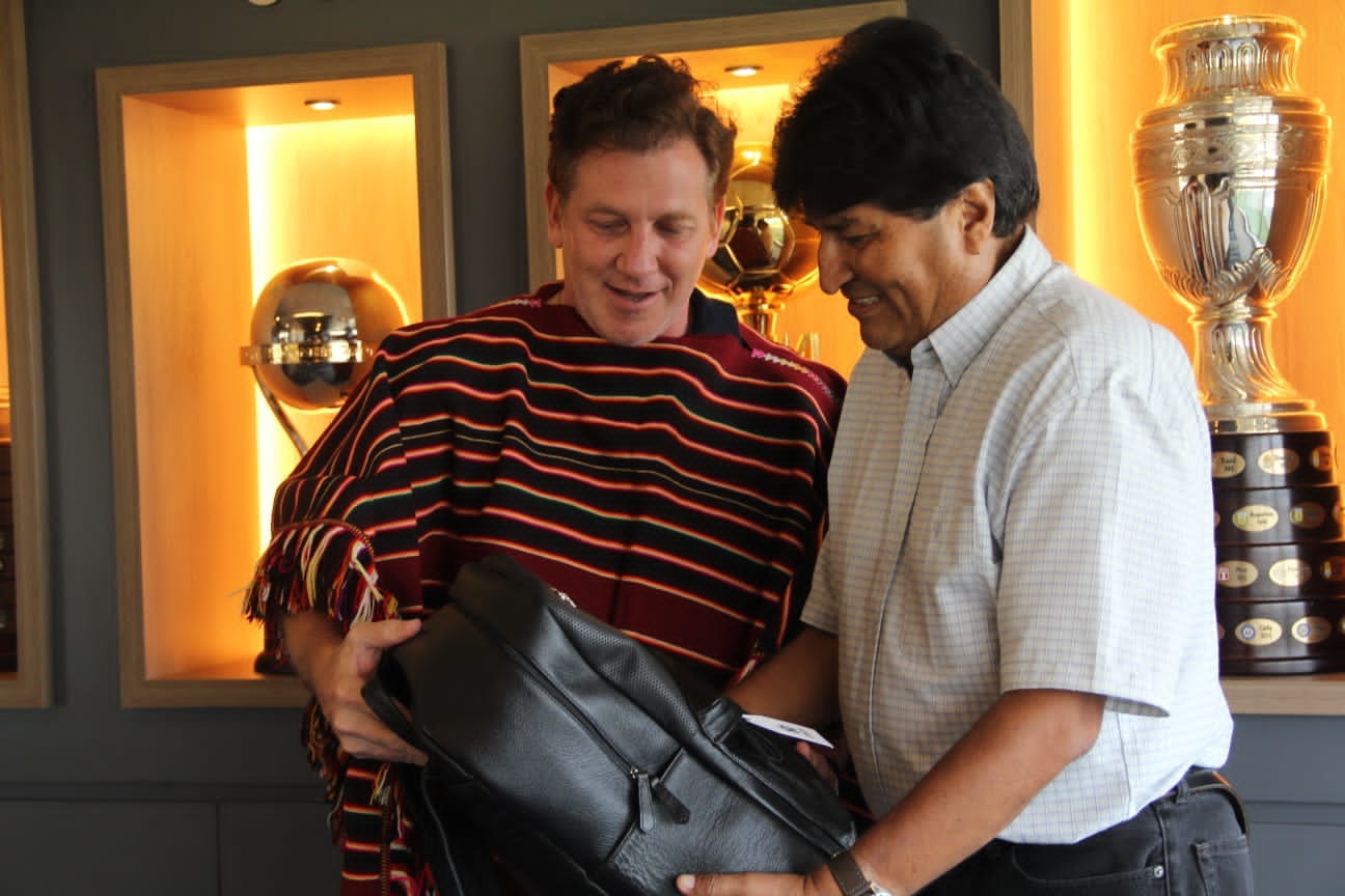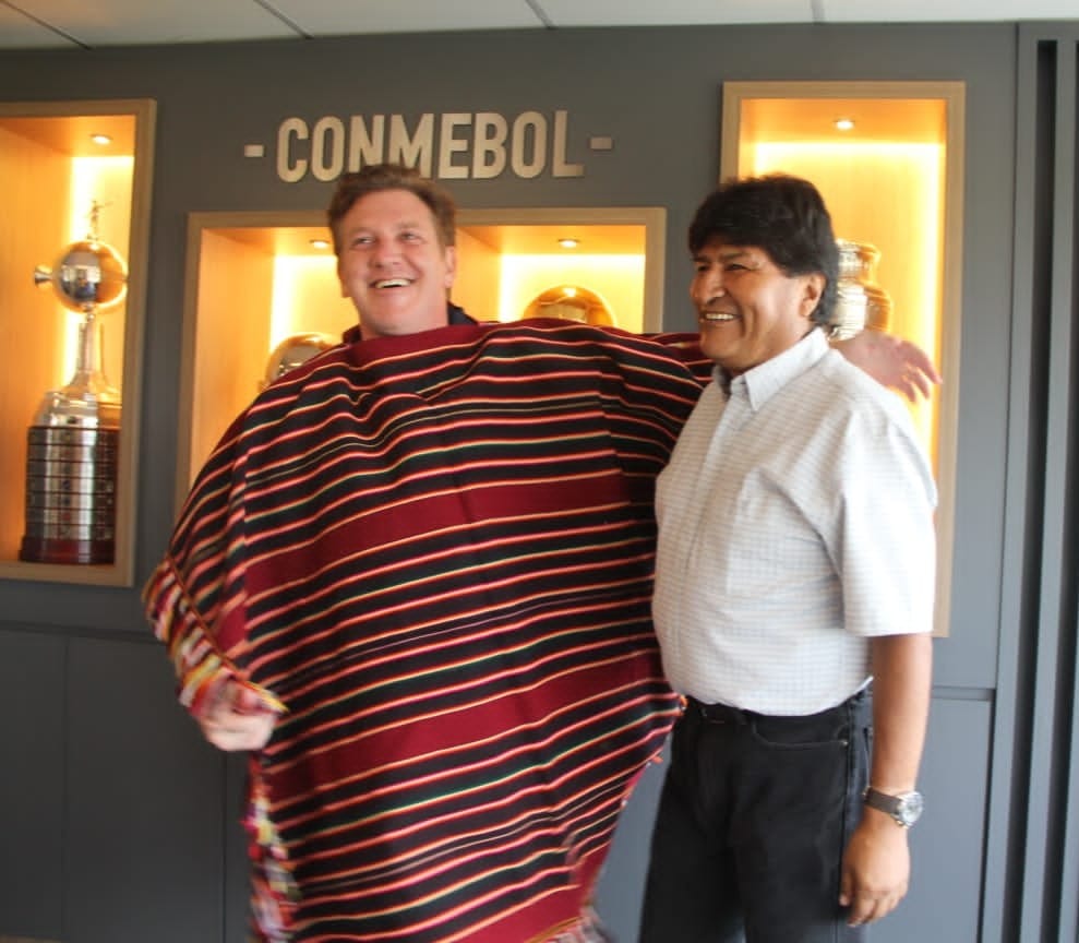 El hermano Evo Morales le entregó por adelantado el regalo de cumpleaños al presidente de la CONMEBOL, Alejandro Dominguez, quien lo invito a la rendición de informé de sus 6 años de gestión como el máximo ente del balón pie en Sud América.