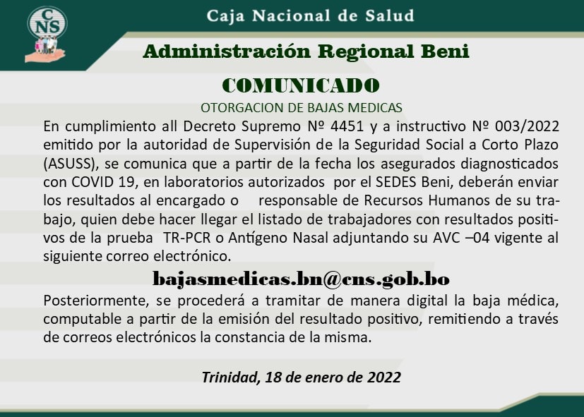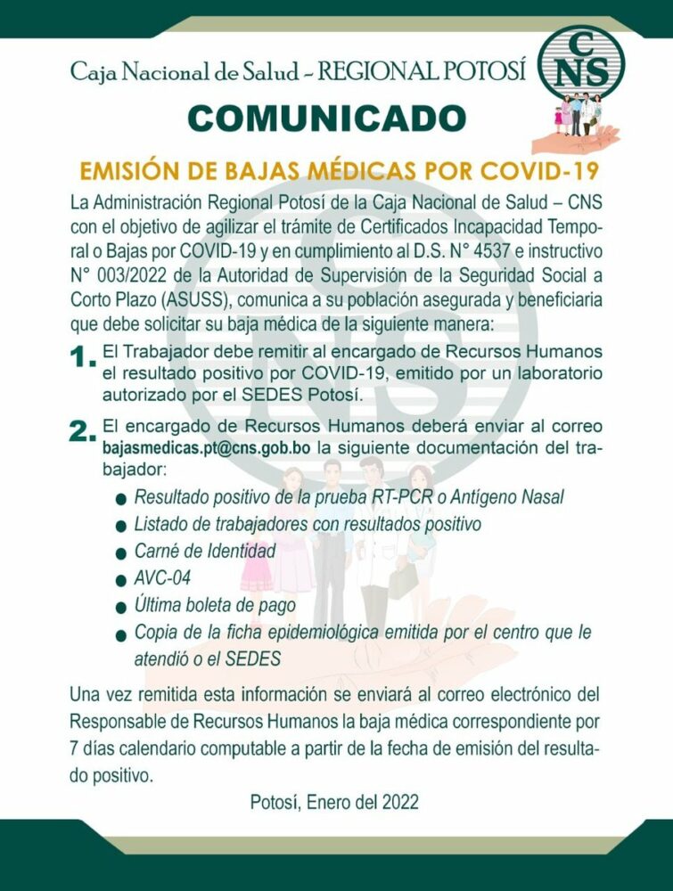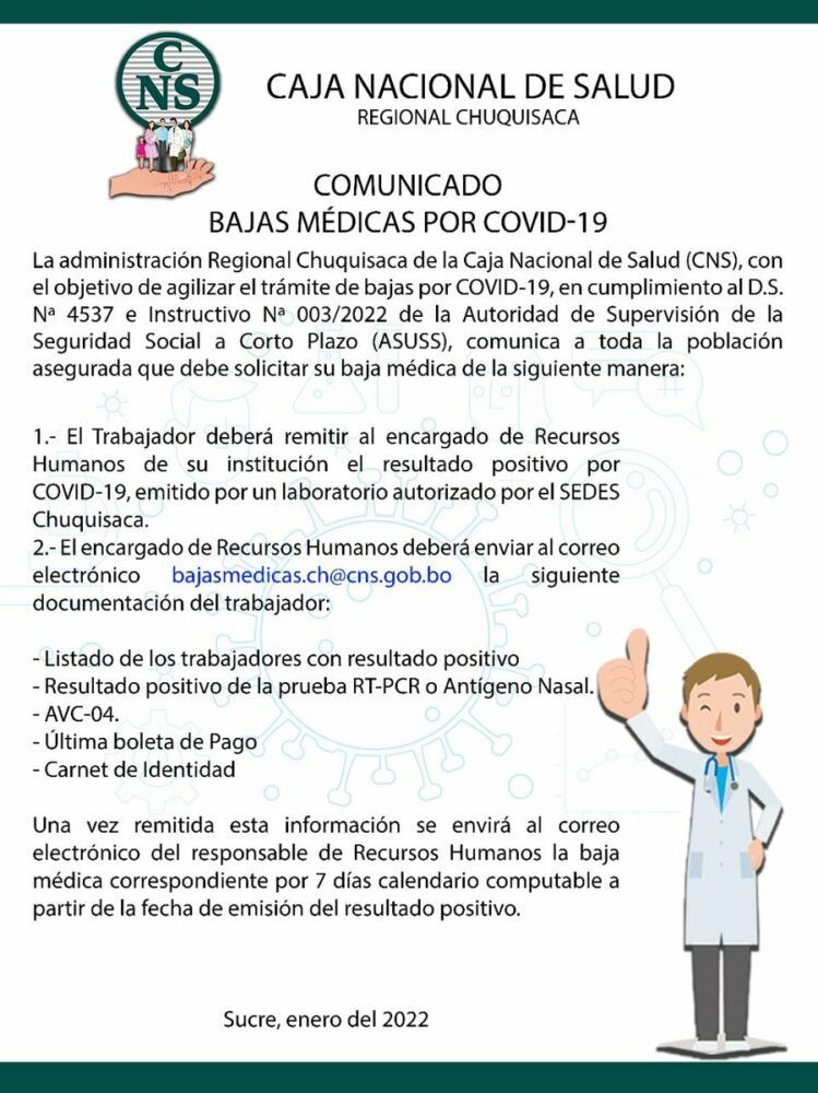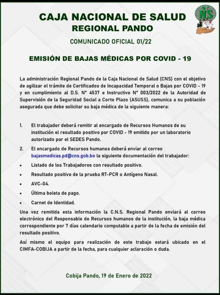 #ANF La Caja Nacional de Salud (CNS) habilitó 19 correos electrónicos para que las empresas e instituciones de asegurados remitan la lista del personal contagiado con #COVID19 y se proporcione la baja médica correspondiente. https://t.co/7MYg7YUa6G