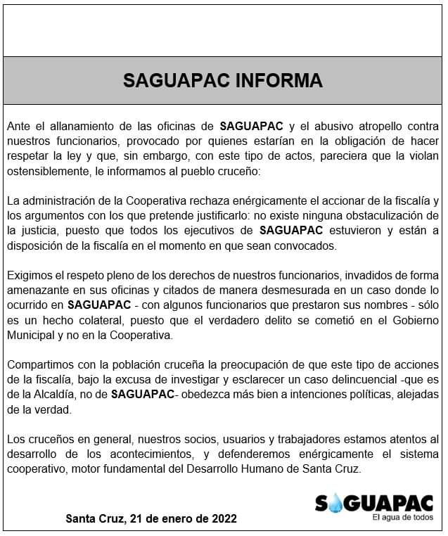 #ANF Saguapac calificó como «abusivo» el allanamiento que realizó la Fiscalía en sus oficinas y negó que estuviera obstaculizando la investigación por el caso ítems fantasmas. https://t.co/kz4Ulidh0F