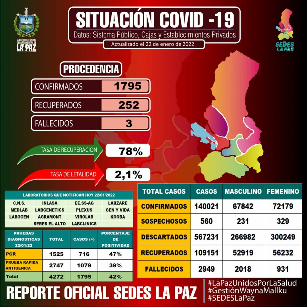 #ANF El Servicio Departamental de Salud de La Paz reportó este sábado 1.795 nuevos contagios de #COVID19, tres fallecidos y 252 recuperados. https://t.co/mMMtuJE6ay