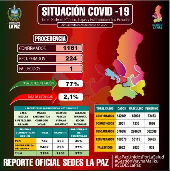 #ANF El Servicio Departamental de Salud de La Paz reporta para este lunes 1.161 nuevos casos positivos de #COVID19 y un deceso. https://t.co/H9To4G3JcJ
