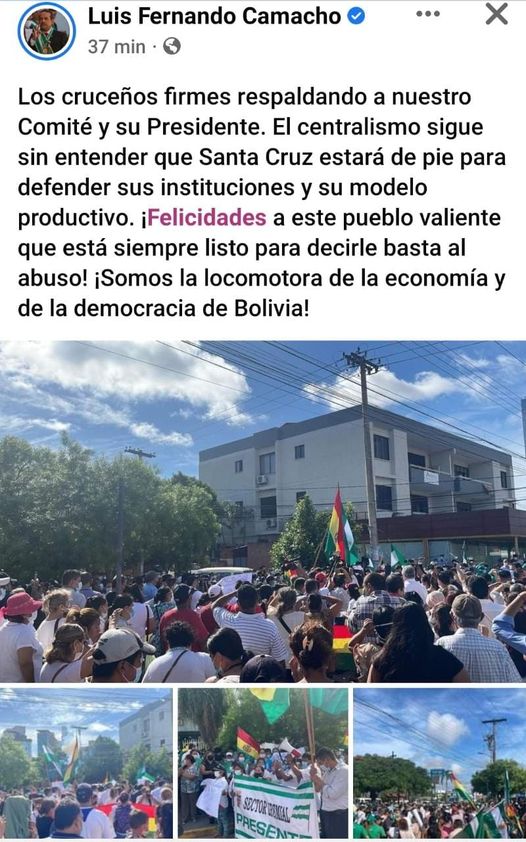 Gobernador Luis Fernando Camacho, felicita el apoyo al presidente del Comité Pro Santa Cruz y la institucionalidad que ve en riesgo.