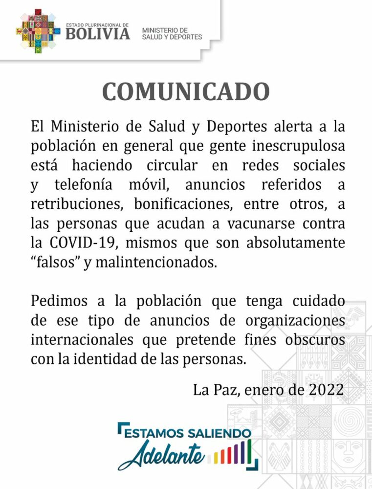 #ANF El Ministerio de Salud alerta sobre gente inescrupulosa que difunde en redes sociales anuncios sobre supuestos pagos a cambio de que acudan a vacunarse. Aclara que esas publicaciones son falsas y malintencionadas. https://t.co/uwfkroFaeb