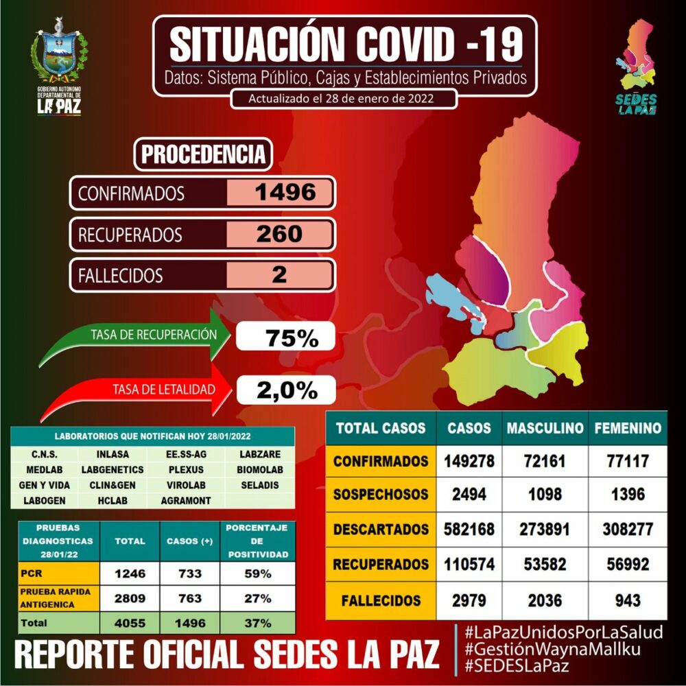 #ANF El Servicio Departamental de Salud de La Paz reporta para este viernes 1.496 nuevos contagios y dos decesos. pic.twitter.com/bXbbXteocL