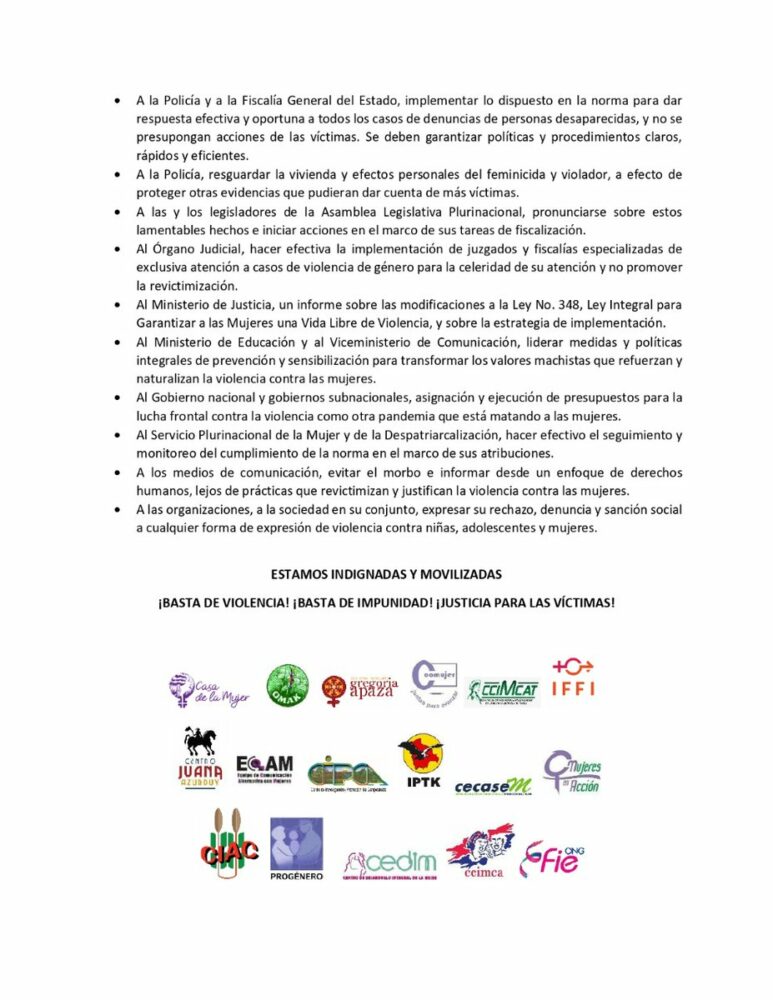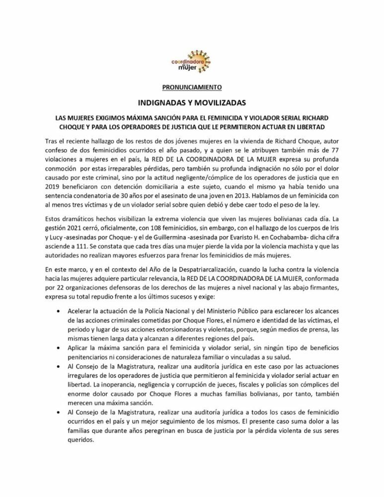 #ANF 22 organizaciones de mujeres a nivel nacional piden a las autoridades de justicia dictar la máxima sanción contra el feminicida serial Richard Choque, al igual para los jueces y fiscales que le favorecieron con detención domiciliaria. https://t.co/LXQlHoDOcB