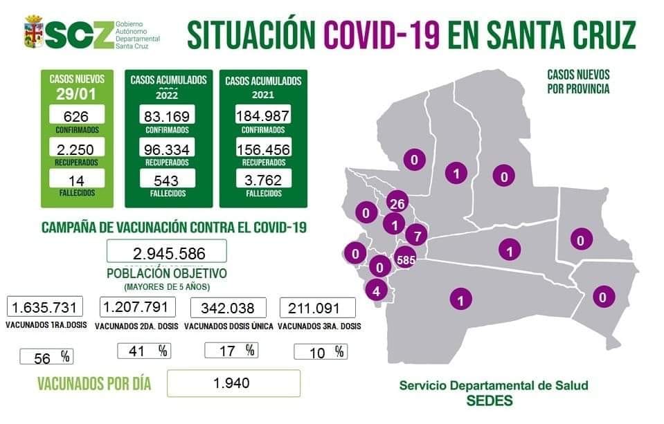 #ANF En Santa Cruz, el Servicio Departamental de Salud registró esta jornada 626 nuevos casos de #COVID19, 14 fallecidos y 2.250 recuperados. pic.twitter.com/0rrOby95FJ